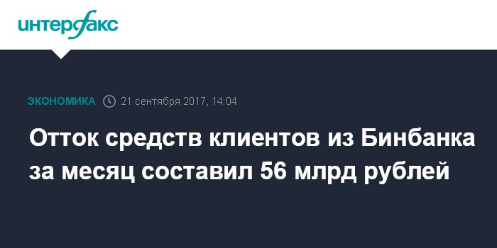Москва. 21 сентября. INTERFAX.RU - Отток средств физлиц и юрлиц из Бинбанка в сентябре составил 56 млрд рублей, сообщил зампред ЦБ Василий Поздышев на пресс-конференции в четверг.