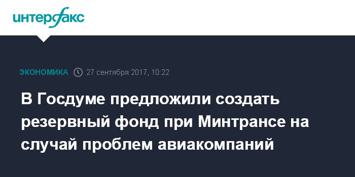 Москва. 27 сентября. INTERFAX.RU - В комитете Госдумы по транспорту предлагают создать специальный резервный фонд при министерстве транспорта РФ во избежание проблем, подобных тем, что возникли из-за остановки рейсов авиакомпании "ВИМ-Авиа".