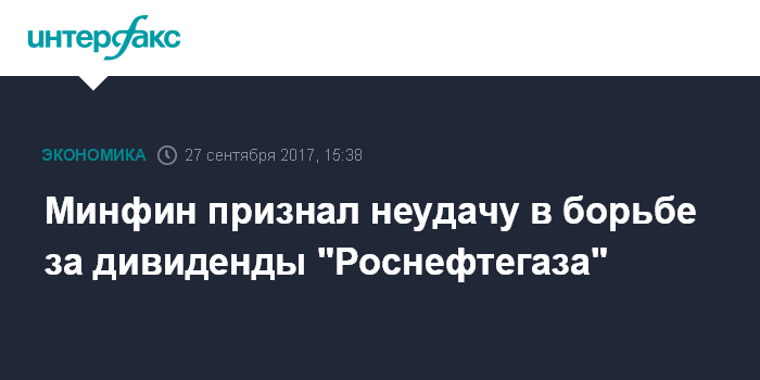 Москва. 27 сентября. INTERFAX.RU - Минфин признал свою неудачу в борьбе за поступление в бюджет текущего года дивидендов госхолдинга "Роснефтегаз", который владеет контролем в "Роснефти".