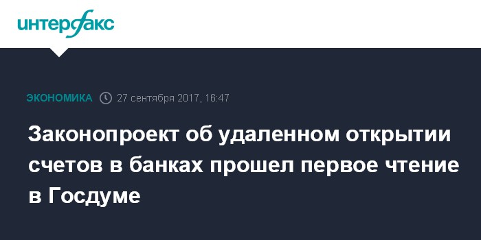 Москва. 27 сентября. INTERFAX.RU - Госдума на заседании в среду одобрила в первом чтении законопроект, позволяющий банкам открывать счета физическим лицам без их личного присутствия, только с использованием данных биометрических паспортов и данных, загруженных на портал "Госуслуги".