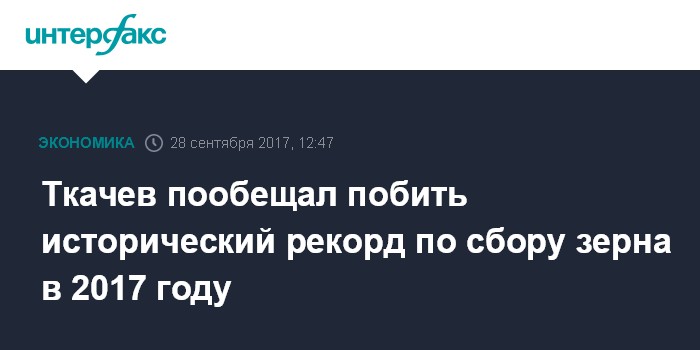 Москва. 28 сентября. INTERFAX.RU - Россия в этом году соберёт рекордный урожай зерна, который будет выше исторического рекорда в 127 млн тонн, сообщил министр сельского хозяйства Александр Ткачев на заседании правительства в четверг. Прежний прогноз Минсельхоза составлял 116-117 млн тонн.