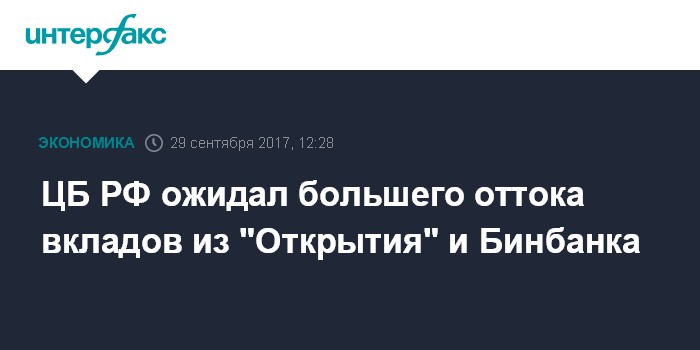 Москва. 29 сентября. INTERFAX.RU - ЦБ РФ ожидал большего оттока вкладов из банка "Открытие" и Бинбанка, решения о санации которых было принято в течение последнего месяца, сообщила председатель Банка России Эльвира Набиуллина.