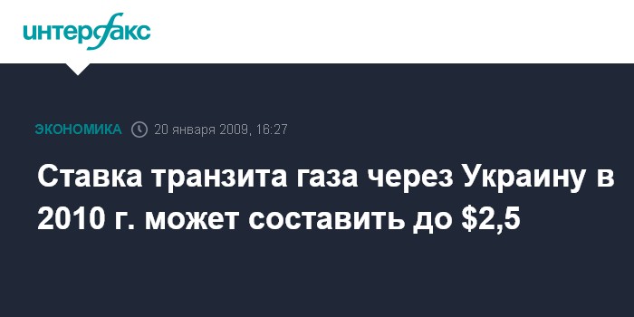 Москва. 20 января. INTERFAX.RU - Ставка транзита российского газа через территорию Украины в 2010 году может составить от $1,7 до $2,5 за 1 тыс. кубометров на 100 км, сообщил журналистам заместитель председателя правления "Газпрома" Александр Медведев.