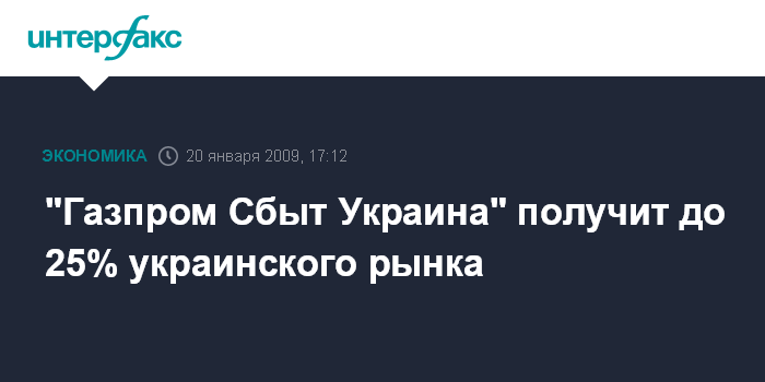 Москва. 20 января. INTERFAX.RU - "Газпром Сбыт Украина" получит до 25% украинского рынка, сообщил заместитель председателя правления "Газпрома" Александр Медведев на пресс-конференции в Москве.