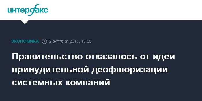 С учетом этого правительство считает достаточными на данном этапе принятые в 2014-2016 годах меры стимулирующего характера в целях повышения привлекательности юрисдикции Российской Федерации для системообразующих организаций российской экономики, делает вывод первый вице-премьер.