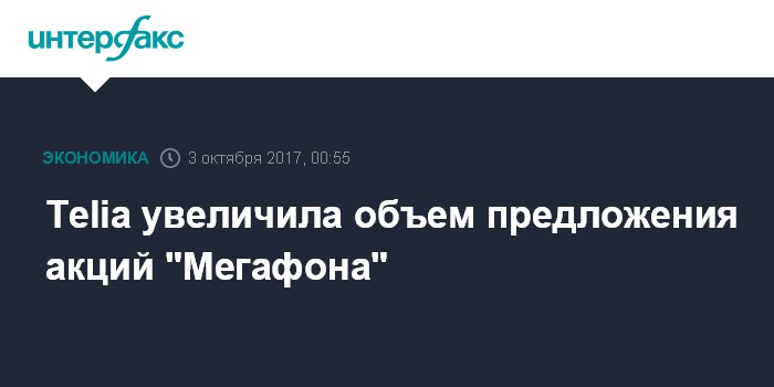 Москва. 3 октября. INTERFAX.RU - Telia Company, продающая на рынке часть своего пакета российского оператора "Мегафон", увеличила объем предложения с 35 млн до 38,5 млн акций (с 5,65% до 6,2% капитала), сообщил "Интерфаксу" источник, знакомый с ходом сделки.