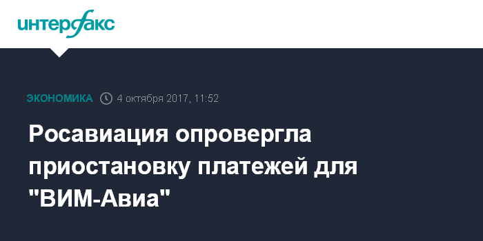 Ранее источник "Интерфакса" в "Аэрофлоте" сообщил, что авиакомпания приостанавливает финансирование перевозок проблемной "ВИМ-Авиа" в связи с отказом главы Росавиации Александра Нерадько подписать и сверить платежи.