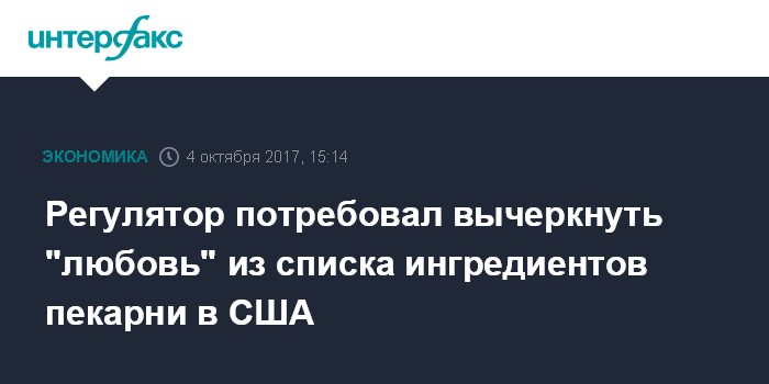 Москва. 4 октября. INTERFAX.RU - Управление по контролю качества продуктов питания и лекарственных препаратов США (FDA) США не оценило креативный подход владельцев пекарни Nashoba Brook Bakery и потребовало удалить слово "любовь" из списка ингредиентов, где оно значилось наряду с овсяными хлопьями, сахаром и орехами.