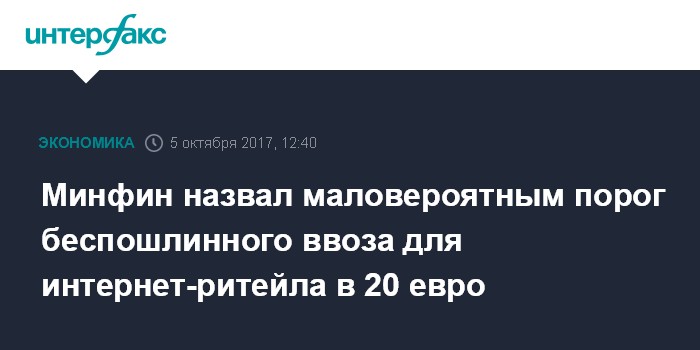 Правительство предложило снизить беспошлинный порог для интернет-покупок до 20 евроЧитать подробнееСазанов подчеркнул, что вариант снижения порога до 20 евро "наименее вероятен с точки зрения экономической логики и с точки зрения отношения к потребителю". "Порог имеет смысл, когда есть какие-то крупные посылки и высокие импортные пошлины, когда в совокупности НДС плюс импортная пошлина в каких-то ситуациях выводили бы на 30%-ную ставку. Поэтому опустить порог до 20 евро и ставку 30% - это избыточное налогообложение интернет-поставок", - сказал также он.