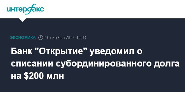 На прошлой неделе банк "Открытие" разместил на Ирландской фондовой бирже сообщение, что планирует списать суборд на $300 млн.