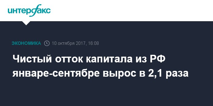 Москва. 10 октября. INTERFAX.RU - Чистый отток капитала из РФ в январе-сентябре 2017 года вырос в 2,1 раза, до $21 млрд, по сравнению с аналогичным периодом 2016 года, когда он составил $10 млрд, свидетельствуют материалы Банка России.