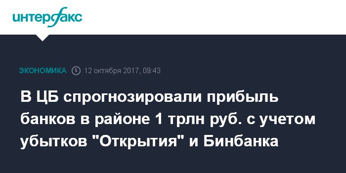 В ЦБ спрогнозировали прибыль банков в районе 1 трлн руб. с учетом убытков "Открытия" и Бинбанка