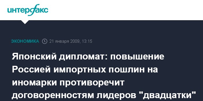 Москва. 21 января. INTERFAX.RU - Япония считает повышение Россией импортных пошлин на иностранные автомобили нарушением договоренностей, достигнутых в ходе саммита "большой двадцатки".