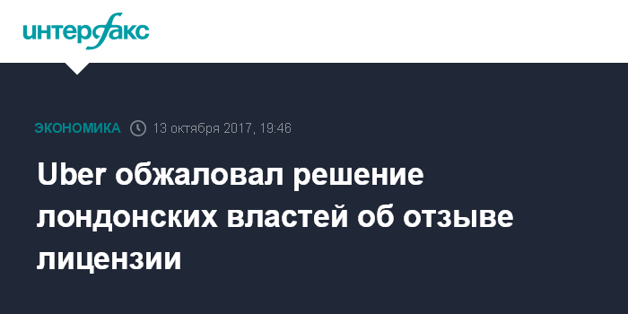 Москва. 13 октября. INTERFAX.RU - Компания Uber Technologies в пятницу направила официальную апелляцию на решение главы Транспортного управления Лондона (TfL) не продлевать лицензию ее сервиса по вызову автомобилей в британской столице.
