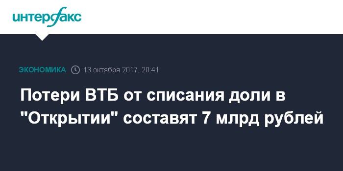 Потери ВТБ от списания доли в "Открытии" составят 7 млрд рублей