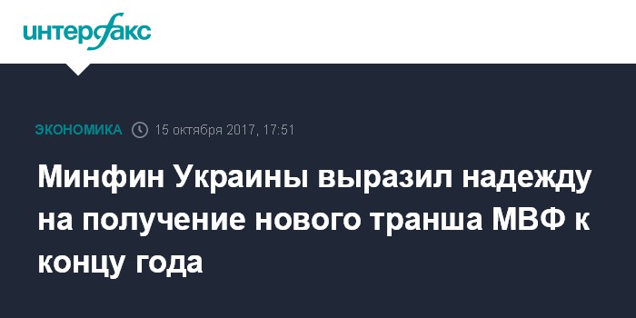 Москва. 15 октября. INTERFAX.RU - Министр финансов Украины Александр Данилюк ожидает получение очередного кредитного транша Международного валютного фонда в рамках программы EFF к концу 2017 года.