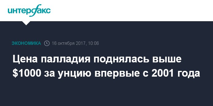 Москва. 16 октября. INTERFAX.RU - Цена палладия поднялась выше $1000 за унцию впервые с 2001 года на фоне увеличения спрос на металл, использующийся, в частности, в производстве устройств контроля выбросов в автомобилях с бензиновыми двигателями.