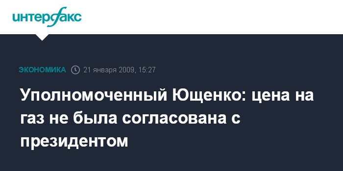 Киев. 21 января. INTERFAX.RU - Цена российского газа для Украины в 2009 г. не была согласована с президентом Виктором Ющенко, заявляет уполномоченный главы украинского государства по международным вопросам энергетической безопасности Богдан Соколовский.