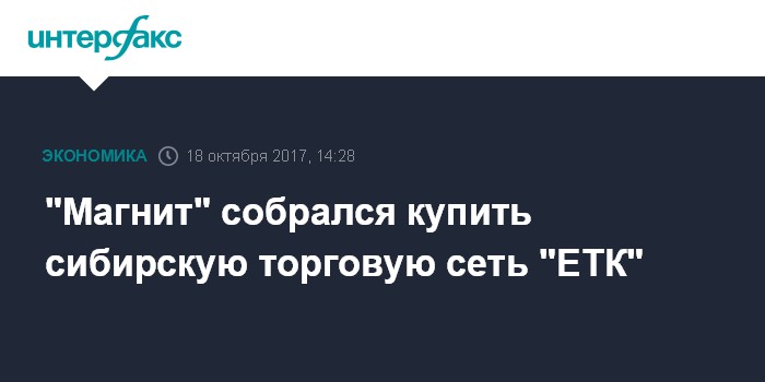 Москва. 18 октября. INTERFAX.RU - Ритейлер "Магнит" направил в Федеральную антимонопольную службу РФ ходатайство о приобретении 100% долей в ООО "ЕТК".