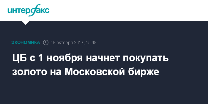 Москва. 18 октября. INTERFAX.RU - Банк России начиная с 1 ноября 2017 года наряду с покупкой золота на внебиржевом рынке будет выставлять заявки на покупку золота на торгах Московской биржи, говорится в сообщении ЦБ.