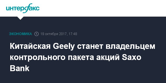 Москва. 19 октября. INTERFAX.RU - Китайская автомобильная группа Zhejiang Geely Holding Group Co. станет держателем контрольного пакета акций датского Saxo Bank.