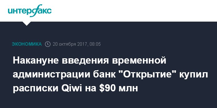 Накануне введения временной администрации банк "Открытие" купил расписки Qiwi на $90 млн