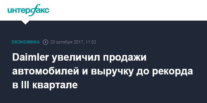 Москва. 20 октября. INTERFAX.RU - Германский автомобилестроительный концерн Daimler AG зафиксировал рекордные продажи и выручку в третьем квартале 2017 года, однако сократил чистую прибыль на 16% на фоне высоких расходов на реструктуризацию, а также издержек, связанных с отзывом автомобилей.
