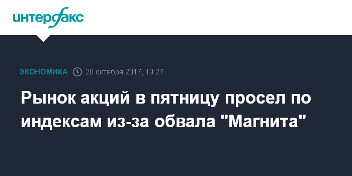 Москва. 20 октября. INTERFAX.RU - Рынок акций РФ в пятницу просел по индексам из-за обвала бумаг "Магнита" на рекордных оборотах к уровням июня прошлого года после публикации слабого отчета ритейлера за третий квартал по МСФО и понижения прогноза по выручке на 2017 год; неделя также завершилась в "минусе".