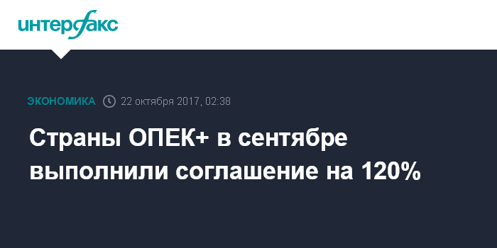 Москва. 22 октября. INTERFAX.RU - Страны ОПЕК и не-ОПЕК, участвующие в соглашении об ограничении нефтедобычи, в сентябре выполнили сделку на рекордные 120%, говорится в пресс-релизе картеля по итогам рассмотрения данных министерским комитетом по мониторингу выполнения сделки.