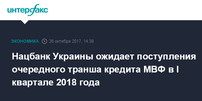Киев. 26 октября. ИНТЕРФАКС-УКРАИНА - Национальный банк Украины (НБУ) закладывает в свои прогнозы продолжение сотрудничества с Международным валютным фондом (МВФ) и ожидает поступления очередного транша по программе EFF в первом квартале 2018 года.