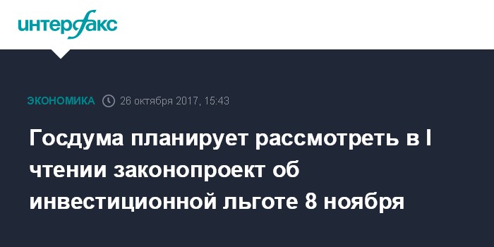 Госдума планирует рассмотреть в I чтении законопроект об инвестиционной льготе 8 ноября