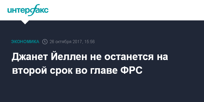 Вашингтон. 26 октября. ИНТЕРФАКС - Джанет Йеллен не останется на второй срок во главе Федеральной резервной системы (ФРС) США. Она больше не участвует в гонке претендентов, пишет издание Politico со ссылкой на источник, который "регулярно" беседует с президентом США Дональдом Трампом.