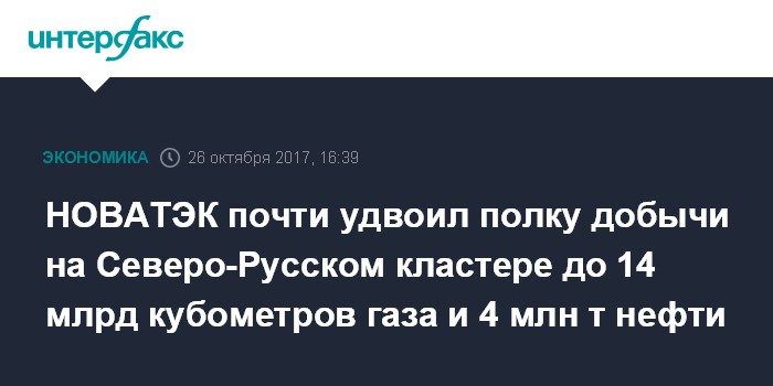 В апреле глава компании Леонид Михельсон говорил, что полка добычи на Северо-Русском кластере составляет 8 млрд куб. м газа и 800 тыс. тонн конденсата. Л.Михельсон говорил, что у "НОВАТЭКа" есть разрешение на подключение этих месторождений к Единой системе газоснабжения (ЕСГ). "Через год выйдем на обустройство и начнем капвложения. Обычно быстро выходим на полку. Думаю, наверное, 2020 год", - сказал он.