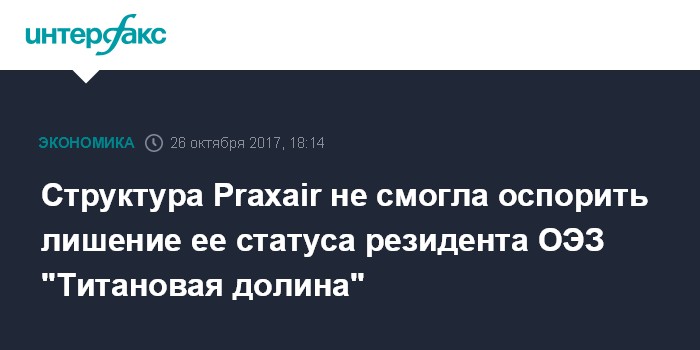 Екатеринбург. 26 октября. ИНТЕРФАКС - ООО "Праксайр Титановая долина" не смогло оспорить решение суда первой инстанции о лишении компании статуса резидента особой экономической зоны (ОЭЗ) "Титановая долина" и назначении штрафа в 5 млн рублей. Об этом говорится в материалах Семнадцатого арбитражного апелляционного суда (Пермь).