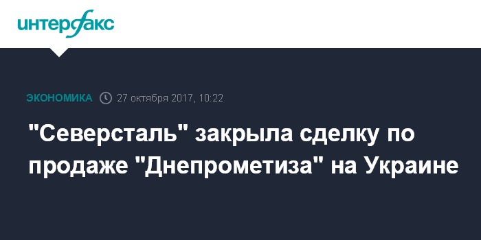Как говорится в сообщении "Северстали", ее дочерняя компания Cambay Services Ltd завершила сделку по продаже 100% акций Dealzone Holding Ltd, владеющей 98,6% украинского ЧАО "Днепрометиз". Условия сделки компании не разглашают.