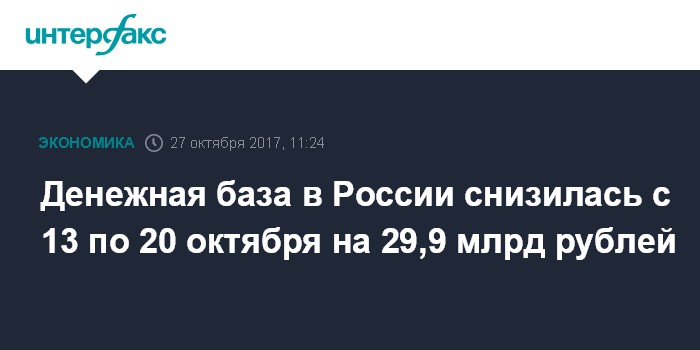 На 13 октября денежная база в России равнялась 9394,8 млрд рублей. Таким образом, за период она снизилась на 0,32%, или на 29,9 млрд рублей.