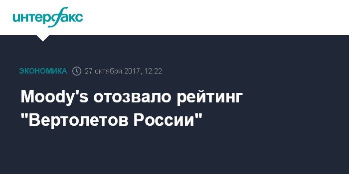 Лондон/Москва. 27 октября. ИНТЕРФАКС - Международное рейтинговое агентство Moody's Investors Service отозвало корпоративный рейтинг (CFR) АО "Вертолеты России" и рейтинг вероятности дефолта (PDR) по причинам делового характера, говорится в пресс-релизе агентства.