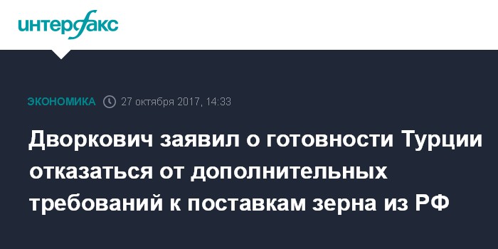 "Мы получили заверение от турецких коллег, что ранее объявленный механизм о необходимости заверения счетов-фактур при поставках зерновых культур и иных культур в консульствах на территории России не будет фактически применяться, если мы увидим позитивные шаги с двух сторон по остальным направлениям", - заявил А.Дворкович журналистам.