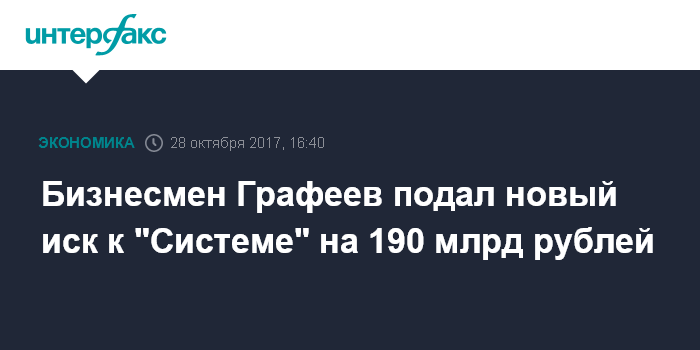 Москва. 28 октября. INTERFAX.RU - Бизнесмен Евгений Графеев подал повторный иск к АФК "Система" и ее дочерней структуре АО "Система-Инвест" о взыскании полученных в 2009-2013 гг. дивидендов НК "Башнефть", увеличив сумму претензий до 190 млрд рублей.