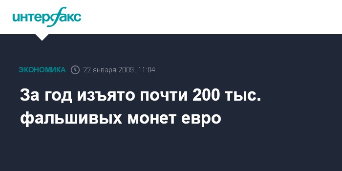 Москва. 22 января. INTERFAX.RU - Количество поддельных монет евро, изъятых в течение 2008 года, исчисляется 195,9 тыс. штуками. Такие статистические данные распространил в среду Европейский центральный банк.