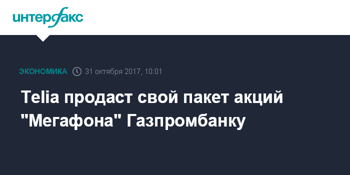 Москва. 31 октября. INTERFAX.RU - Скандинавский холдинг Telia Company окончательно выходит из капитала "Мегафона": оставшиеся 19% российского сотового оператора будут проданы Газпромбанку, сообщила Telia во вторник. Цена сделки составит 514 рубля за акцию, или 60,4 млрд рублей за весь пакет.