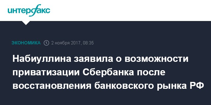 Москва. 2 ноября. INTERFAX.RU - К обсуждению приватизации Сбербанка России можно будет вернуться после восстановления банковского рынка РФ и роста доверия к частным банкам, сообщила председатель ЦБ РФ Эльвира Набиуллина в интервью Handelsblatt.