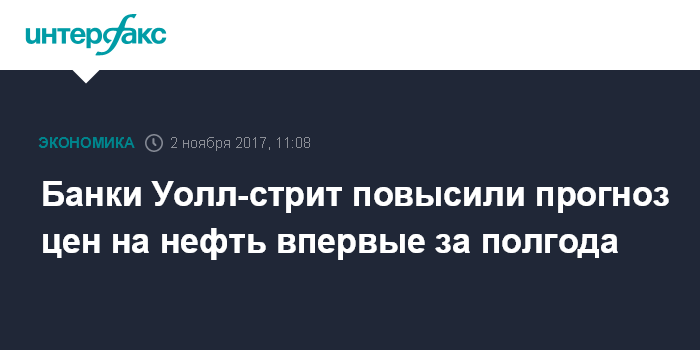 Москва. 2 ноября. INTERFAX.RU - Банковские аналитики Уолл-стрит повысили прогноз цен на нефть впервые за полгода, свидетельствуют результаты ежемесячного исследования The Wall Street Journal. Улучшение настроений обусловлено появлением признаков того, что сокращение добычи нефти крупнейшими мировыми поставщиками способствует ребалансировке рынка.