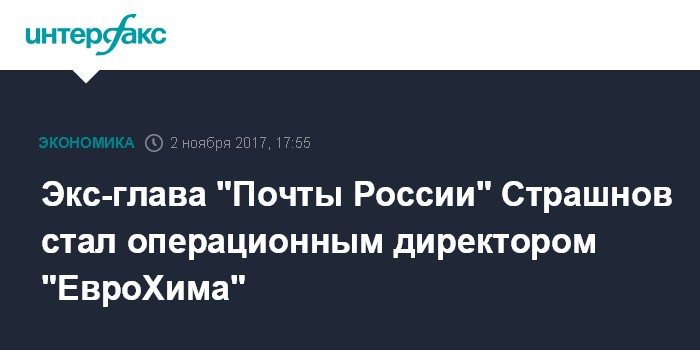 Москва. 2 ноября. INTERFAX.RU - Экс-глава "Почты России" Дмитрий Страшнов назначен на вновь созданную должность операционного директора группы "ЕвроХим", говорится в сообщении компании.