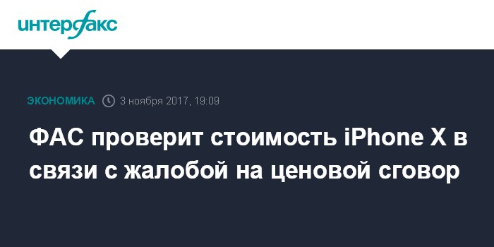 Москва. 3 ноября. INTERFAX.RU - Федеральная антимонопольная служба (ФАС) РФ проанализирует ситуацию с ценообразованием на iPhone X в связи с поступившей в ведомство жалобой на возможный сговор при установлении цен на флагманский телефон Apple в рознице. "В связи с жалобой гражданина на одинаковые цены на iPhone X, ФАС России будет проводить проверку ценообразования", - сообщили "Интерфаксу" в пресс-службе ведомства.