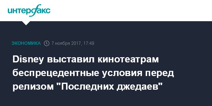 Москва. 7 ноября. INTERFAX.RU - Киностудия Walt Disney, лидер мирового кинорынка в последние годы, выдвинула ряд беспрецедентных требований к американским кинотеатрам, которые хотят показывать у себя фильм "Звездные войны: Последние джедаи" пишет The Wall Street Journal.