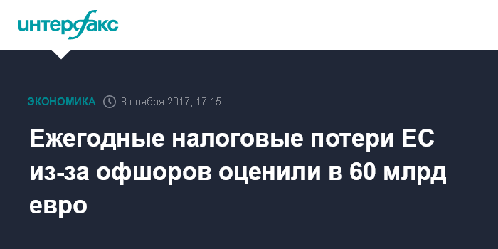 Москва. 8 ноября. INTERFAX.RU - Европейский союз ежегодно недополучает 60 млрд евро в виде налога на прибыль предприятий из-за того, что международные компании регистрируют юридические лица в так называемых налоговых оазисах, пишет немецкая газета Suddeutsche Zeitung со ссылкой на расчеты французского экономиста Габриэля Цукмана.
