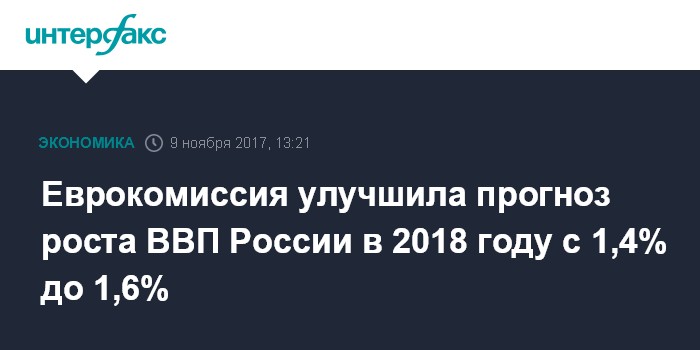 Москва. 9 ноября. INTERFAX.RU - Европейская комиссия (ЕК) прогнозирует увеличение ВВП России на 1,6% в 2018 году, что лучше майской оценки, составлявшей 1,4%.