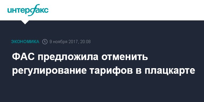 Москва. 9 ноября. INTERFAX.RU - Федеральная антимонопольная служба предлагает с 1 июня 2018 г. отменить регулирование тарифов в плацкартных и общих вагонах поездов дальнего следования и перейти на субсидирование маршрутов.