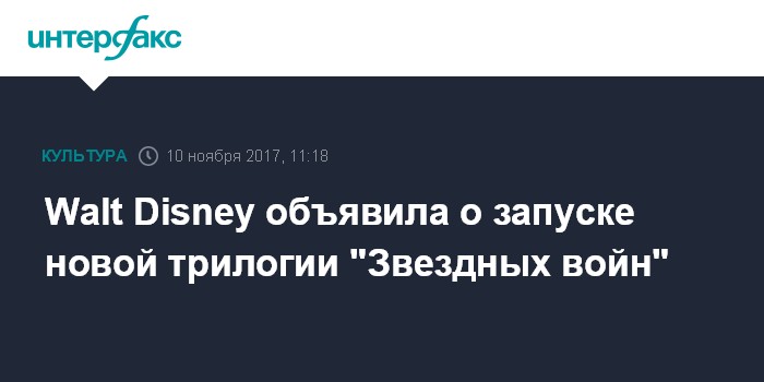 Москва. 10 ноября. INTERFAX.RU - Американская Walt Disney Co., крупнейшая в мире компания в сфере развлечений и медиа, в ночь на пятницу объявила о планах снять очередную, четвертую по счету, трилогию звездной саги "Звездные войны".